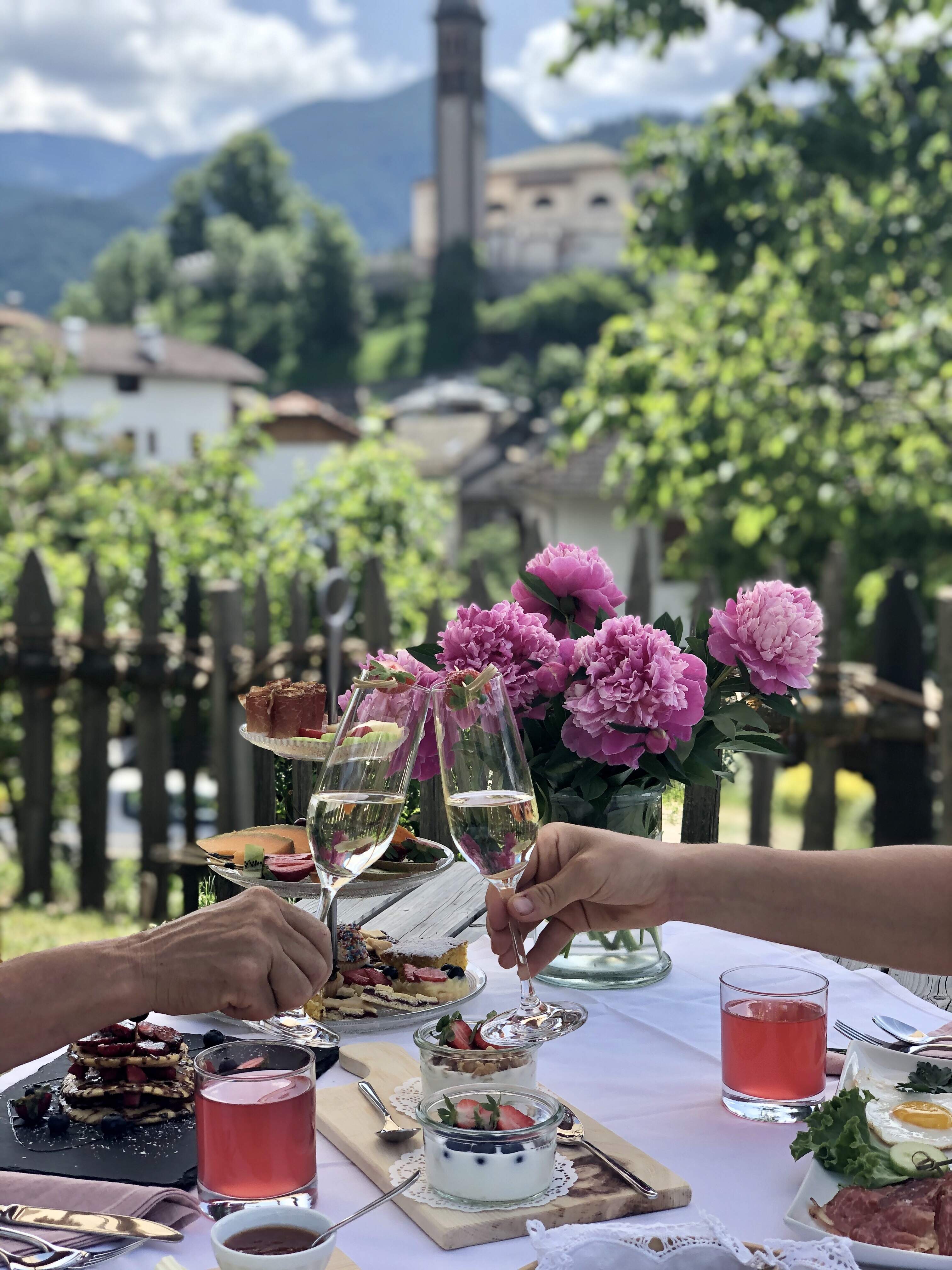 Al Maso Corradini ti aspetta un tavolo in mezzo al giardino, una vista mozzafiato sul Lagorai, prelibatezze dolci e salate, un delizioso cappuccino con il latte appena munto.